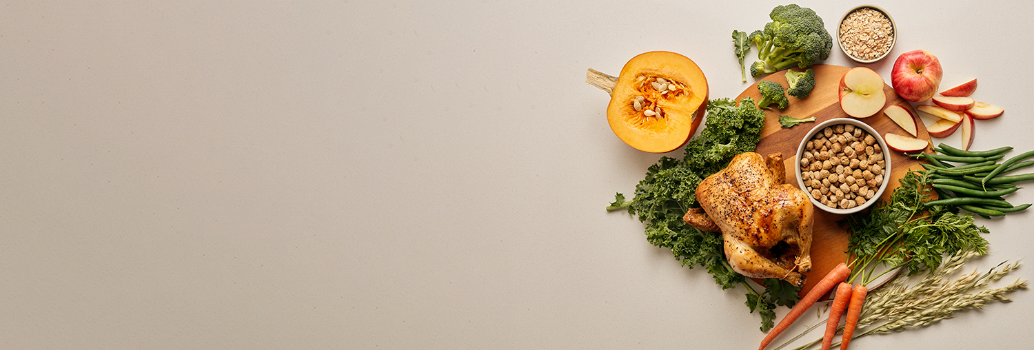 チキン平飼いチキン、野菜、サーモンオイル、プロバイオティクスを、犬にとって最適なバランスで配合。